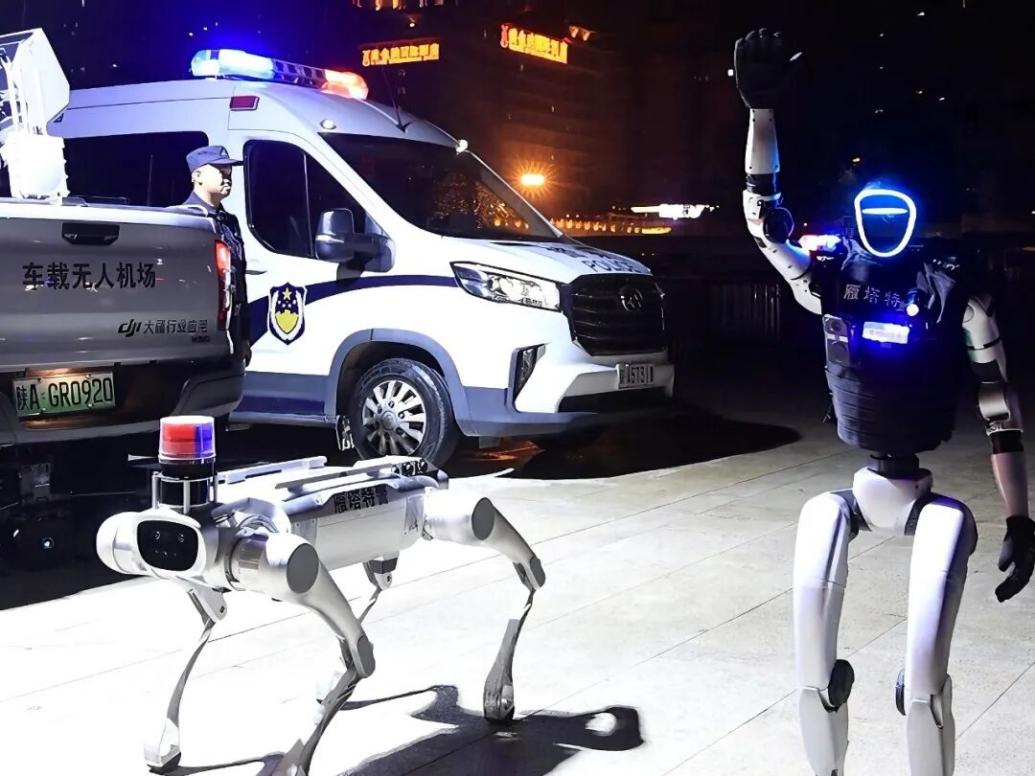 与此同时,警用机器人在大唐不夜城沿核心路段循环巡逻,声光警示装置提醒游客注意安全;机器狗身扛高清摄像头在人群中灵活穿梭,实时传输现场画面;警用升降台高高升起,成为节日期间独特的“瞭望塔”。这些智能装备与执勤民警并肩而立,在古老的土地上勾勒出未来警务的雏形。