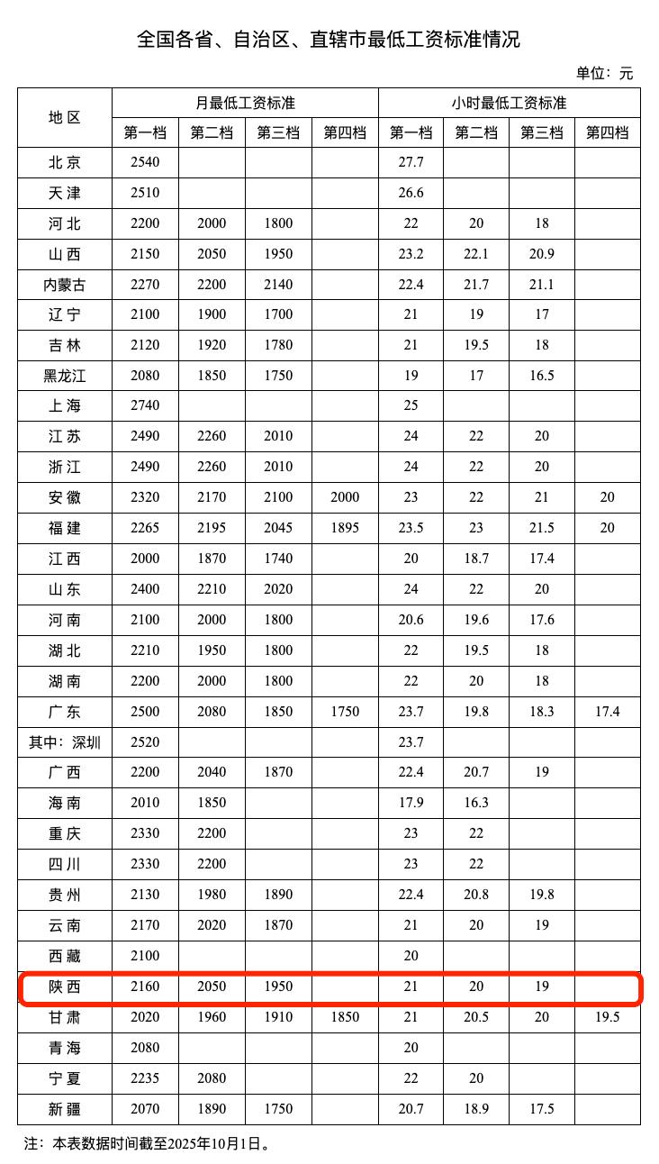 近日,人社部官网发布了《全国各省、自治区、直辖市最低工资标准情况(截至2025年10月1日)》。其中,陕西第一档月最低工资标准为2160元,第一档小时最低工资标准为21元。