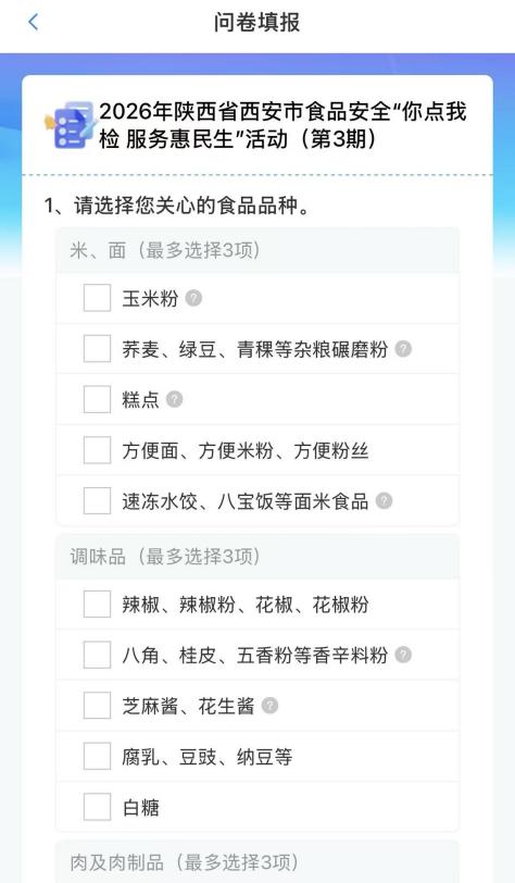据悉,此次“你点我检”为2026年第三期,抽检的食品类型有米、面、调味品、肉及肉制品、儿童食品、餐饮食品等10类食品品种。市民可扫描下方二维码投票,陕西省市场监督管理局将根据投票结果开展定向抽检并及时公布检测结果。
