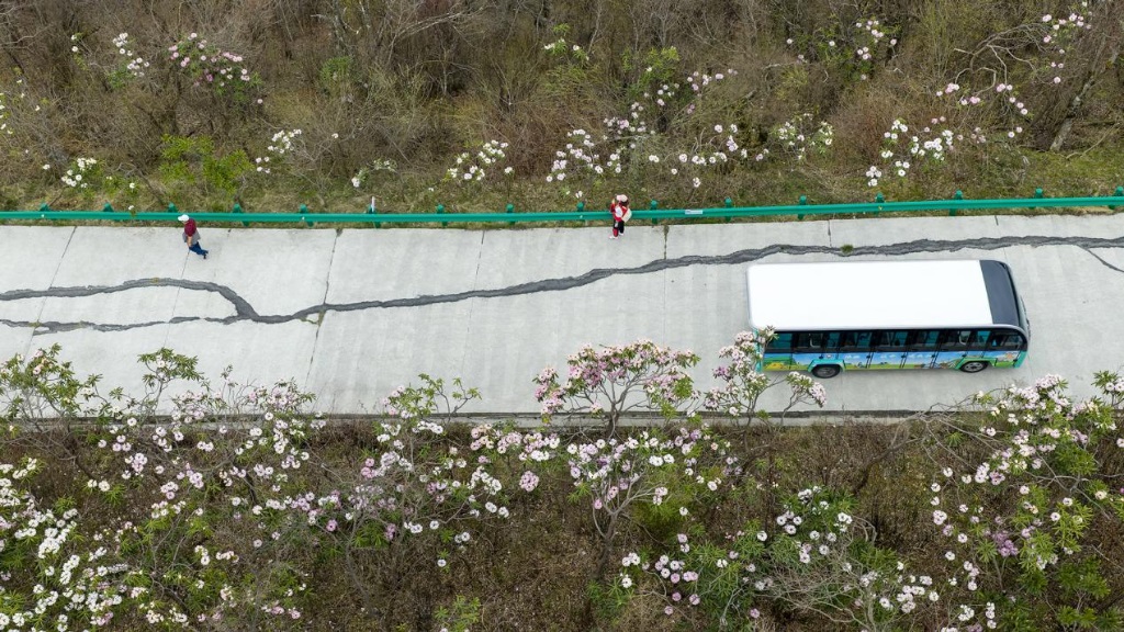 龙头山景区观光车穿行于盛放的高山杜鹃花海间。