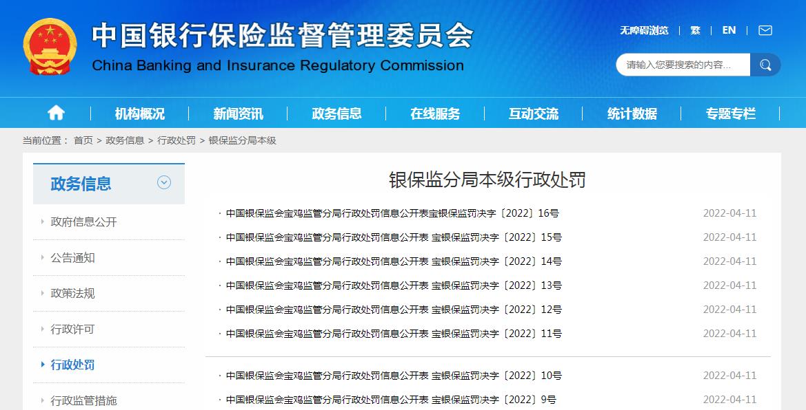 宝鸡银保监分局一天开出16张罚单 3保险公司被处罚 罚款总额27万余元