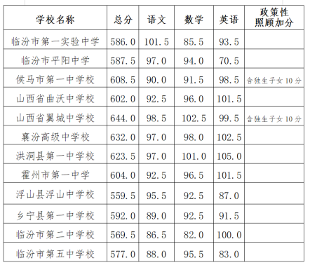 省、市直学校临汾一中、临汾三中、山西师范大学实验中学、临汾市第一实验中学、临汾市平阳中学校执行尧都区最低录取控制分数线。