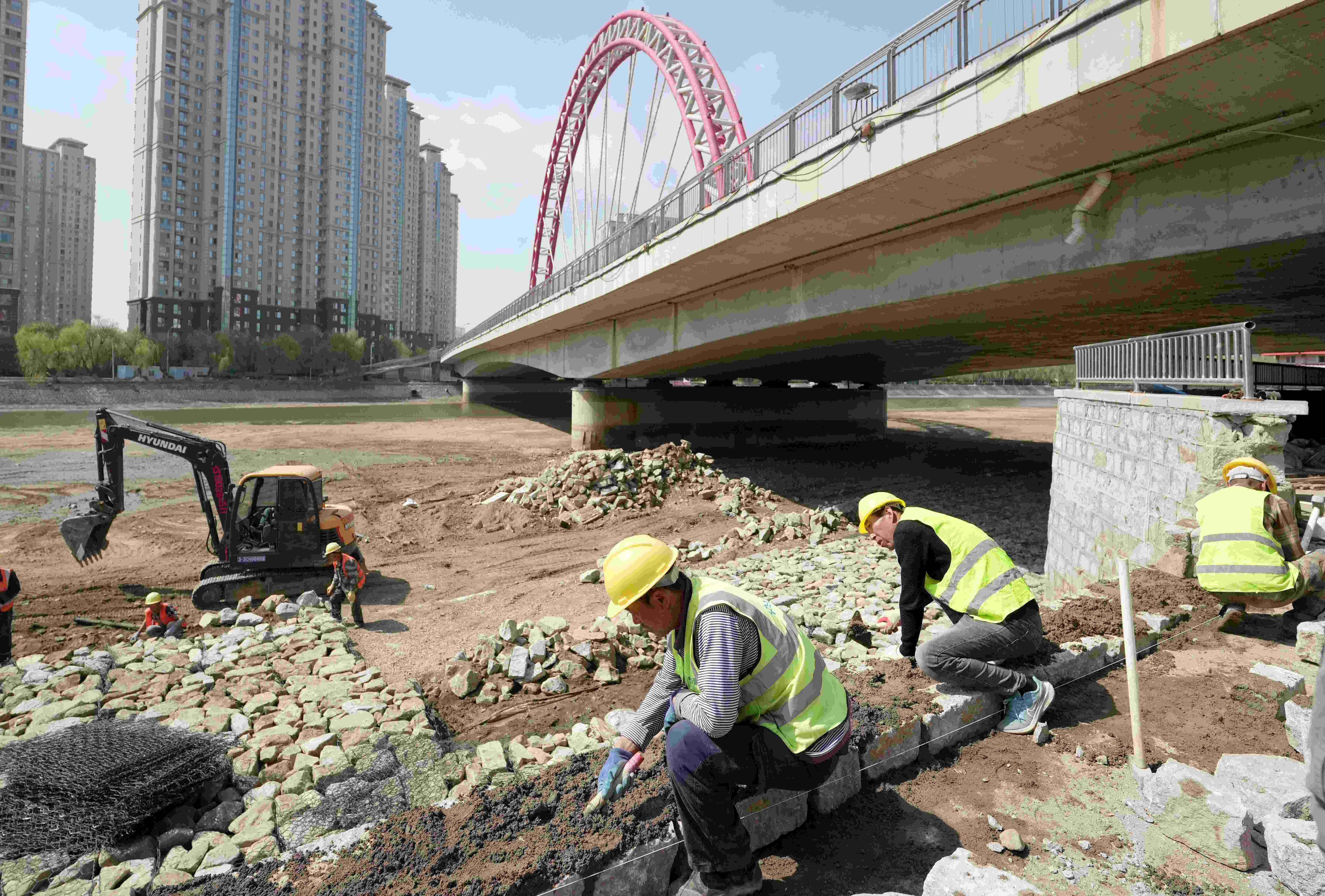 4月29日,工人在河北省秦皇岛市大汤河防洪治理项目建设工地施工