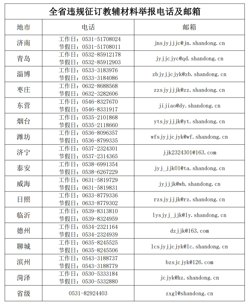 8月26日,山东省教育厅网站发布全省违规征订教辅材料举报电话及邮箱,详情如下: