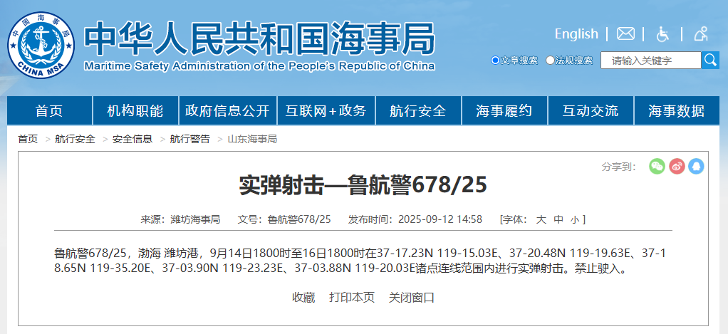 近日,山东潍坊海事局发布航行警告,9月14日18时至16日18时,在渤海潍坊港相关水域进行实弹射击,禁止驶入。
