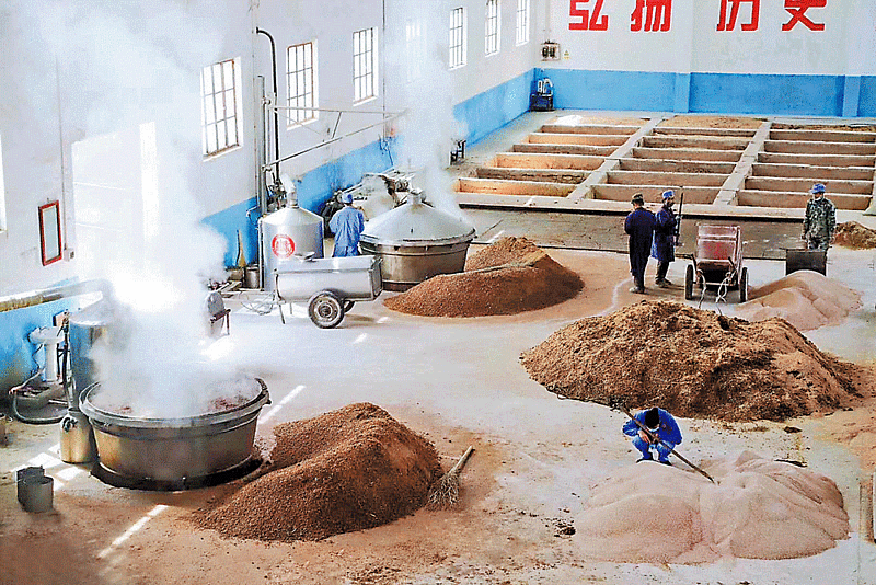 酒厂工人正在冲洗甑盖