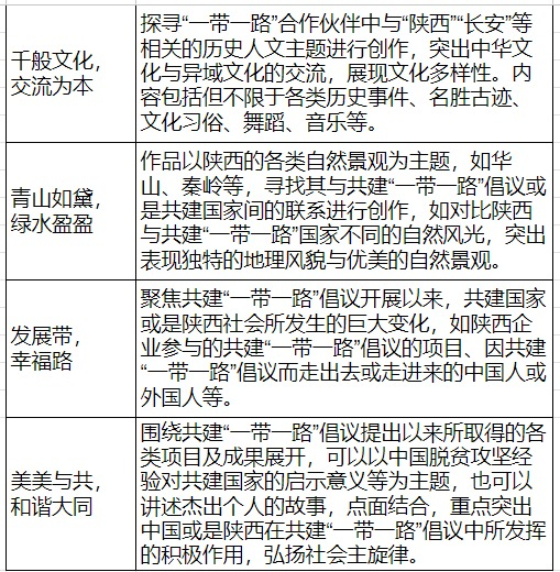 参赛作品以陕西各界参与共建“一带一路”倡议下的基础设施建设、民生发展、友好往来、互联互通、成果总结、未来展望等内容为主题,以多元视角、真实影像、生动话语讲述陕西各方共建“一带一路”倡议的故事。