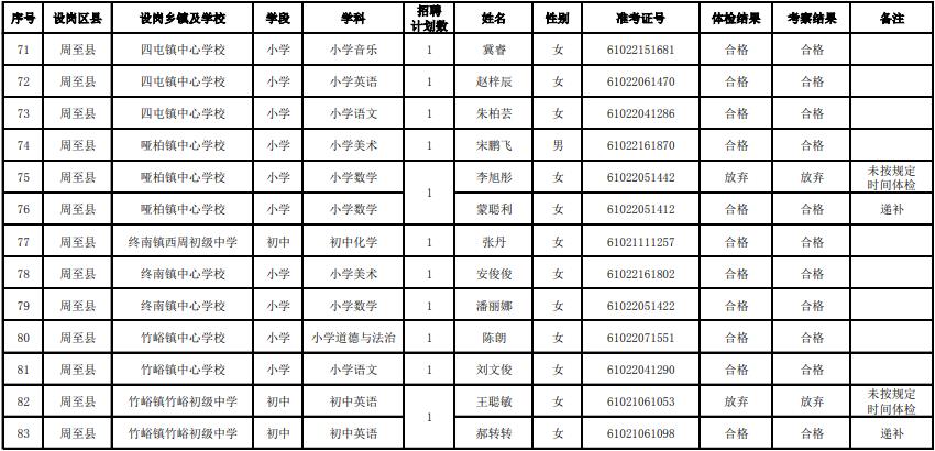 根据陕西省教育厅、省委编办、省财政厅、省人社厅和省医保局《关于做好2024年农村义务教育阶段学校教师特设岗位计划实施工作的通知》(陕教〔2024〕22号)和《西安市2024年农村义务教育阶段学校特设岗位教师招聘公告》精神,西安市2024年农村义务教育阶段学校特设岗位教师招聘体检考察工作已经结束,现将体检考察情况及拟聘用人员予以公示(详见附件)。公示期8月21日-8月27日。如有异议,可拨打受理电话进行反映,核实后予以公示。