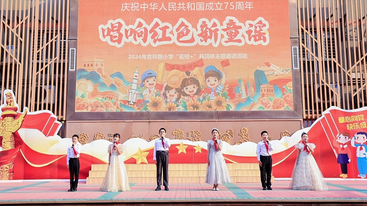 在此举国欢庆的时刻,西安市雁塔区吉祥路小学、陕钢子校、燎原小学、98中学小学部、吉祥路小学延兴门分校的师生代表欢聚一堂,举办“名校+”共同体“唱响红色新童谣”迎国庆主题诵读活动。