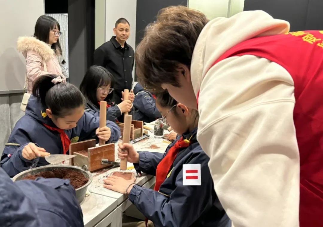 第四展厅青铜工坊活动室内,同学们穿越千年,化身“青铜小工匠”,在专业老师的指导下,同学们体验了青铜铸造方法。从制作模具到浇注铜液,每一步都充满了探索与发现的喜悦,过程中大家对古人的精湛工艺由衷地发出赞叹与敬佩。