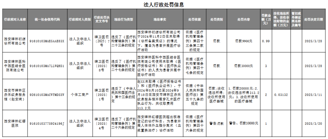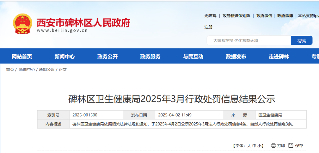 4月2日,碑林区卫生健康局发布2025年3月行政处罚信息结果公示。