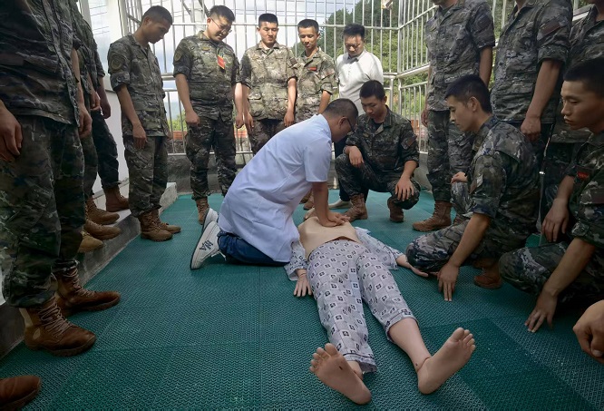 县医院急诊科专家为官兵带来了健康知识讲座、中暑的急救与预防,心肺复苏急救技能培训。在活动中,县医院急诊科医生现场教授外伤急救、止血包扎、中暑预防等急救知识,并借助教学模拟人一对一指导实操心肺复苏技能,帮助官兵掌握急救技能。