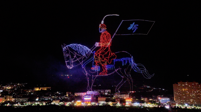 夜幕下的“科技+文化”秀更惊艳。无人机编队在夜空盘旋,时而化作骏马奔腾的清晰轮廓,时而勾勒折家将报效祖国的壮阔景象,转瞬又变作“府谷”的醒目字样。光影流转间,传统底蕴与现代活力同框呈现,观众纷纷举着手机追拍,朋友圈被“府谷夜景”的九宫格刷了屏。“看到这些壮观的画面,我心情很激动。”外地游客张建国说,“让我们老年人大开眼界,感受到了府谷不一般的风情;特别是府谷近年来的变化,让我们耳目一新。”