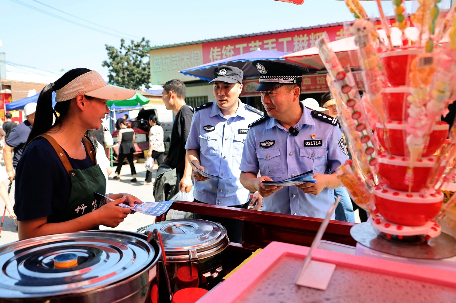 当天上午,焦岱大集街道上人头攒动,叫卖声、议价声此起彼伏。街道两旁摆满了各式各样的摊位,商品琳琅满目,涵盖了吃穿用度等各个方面,吸引着周边群众以及不少从市区赶来的游客。蓝田县公安局焦岱派出所所长臧文涛和民警走在熙熙攘攘的人群中,一边为大家发放反诈宣传单,一边通过真实案例为大家剖析“网络购物”“网络贷款”“网络刷单”以及“微信冒充好友”等高发电信网络诈骗形式。