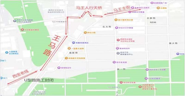 非机动车辆行人绕行路线为大原村前往马王主街方向非机动车辆及行人,通过西宝老线、王马路、马王人行天桥、马王主街绕行;马王主街前往大原村方向非机动车辆及行人,通过马王主街、马王人行天桥、王马路、西宝老线绕行。