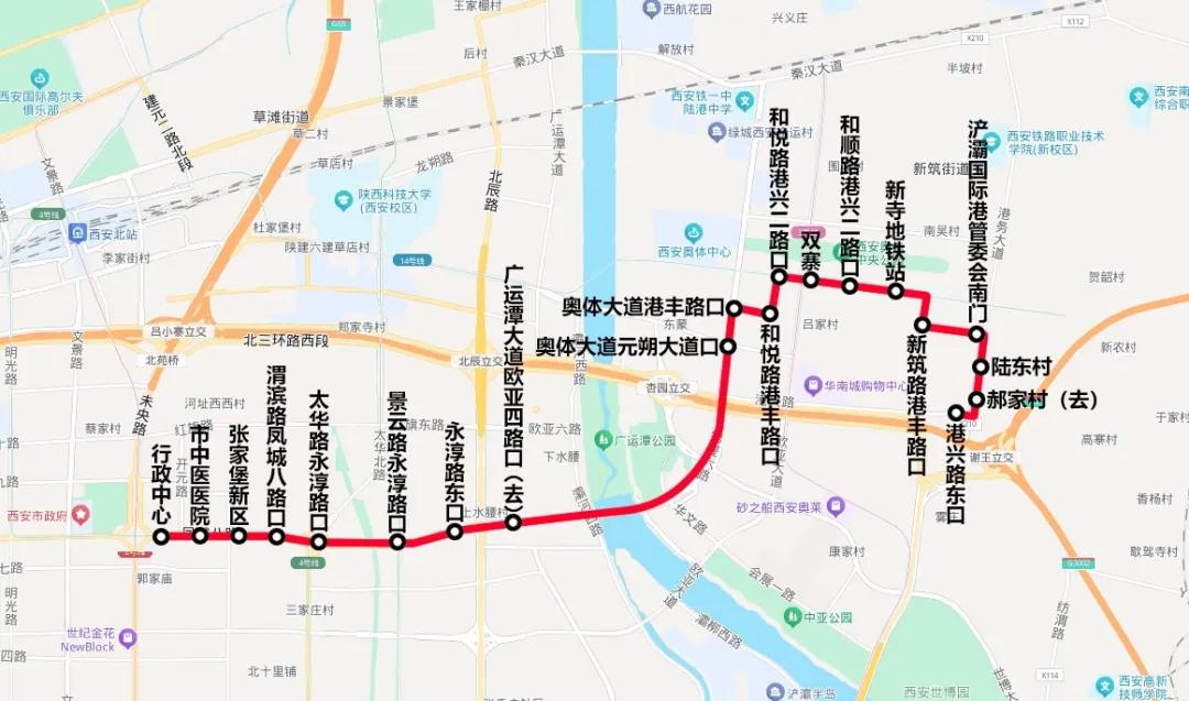 线路设置站点20个:港兴路东口、郝家村(去)、陆东村、浐灞国际港管委会南门、新筑路港丰路口、新寺地铁站、和顺路港兴二路口、双寨、和悦路港兴二路口、和悦路港丰路口、奥体大道港丰路口、奥体大道元朔大道口、广运潭大道欧亚四路口(去)、永淳路东口、景云路永淳路口、太华路永淳路口、渭滨路凤城八路口、张家堡新区、市中医医院、行政中心。