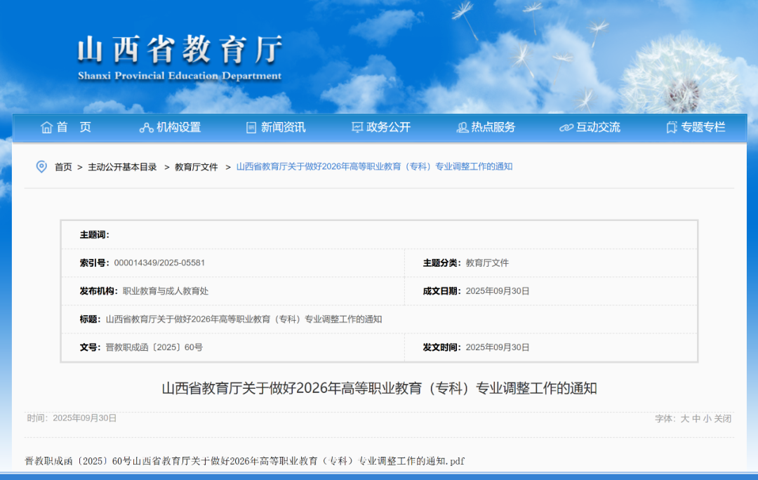 为贯彻落实《教育强省建设规划纲要(2024—2035年)》和全国、全省教育大会精神,持续优化山西省高等职业学校专业结构,努力打造特色化、数智化、品牌化的产教融合型专业,提高人才培养和区域发展需求契合度,提升高等职业教育服务国家战略和山西高质量发展能力。日前,山西省教育厅发布《关于做好2026年高等职业教育(专科)专业调整工作的通知》。
