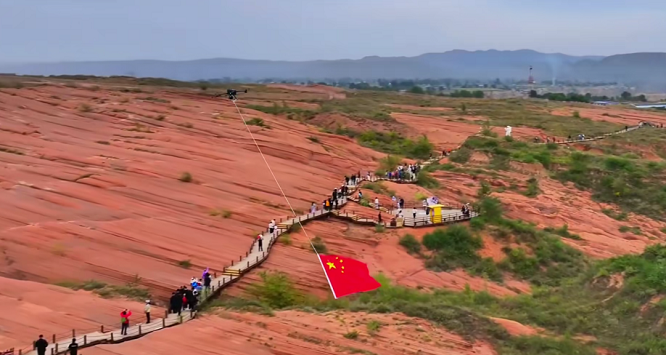 这个国庆,波浪谷的丹霞地貌因爱国热忱更显炽热。10月1日清晨,一架无人机悬挂巨幅五星红旗掠过赤壁丹崖,鲜艳的红色与层叠的地质纹理交相辉映,瞬间点燃全场游客热情。“我和我的祖国,一刻也不能分割……”自发聚集的游客们挥舞国旗,合唱声浪响彻山谷,一位来自山东的游客李女士眼眶泛红:“站在亿万年形成的丹霞前唱国歌,那种震撼与自豪,毕生难忘!”