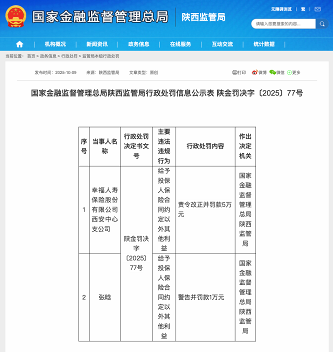 10月9日,国家金融监督管理总局陕西监管局发布行政处罚信息显示,因给予投保人保险合同约定以外其他利益,幸福人寿保险股份有限公司西安中心支公司被责令改正并罚款5万元,张晗被警告并罚款1万元。