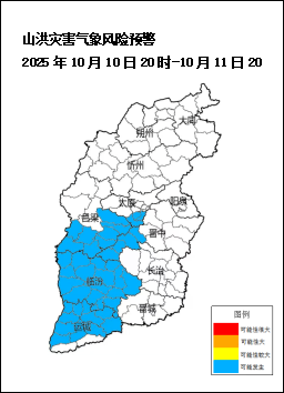 预计10月10日20时至10月11日20时,受强降雨影响,山西省太原南部、吕梁南部、晋中西南部、临汾、运城5个市43个县可能发生山洪(蓝色预警)。其他地区也可能因局地短历时强降水引发山洪灾害,请各地注意做好实时监测、防汛预警和转移避险等防范工作。