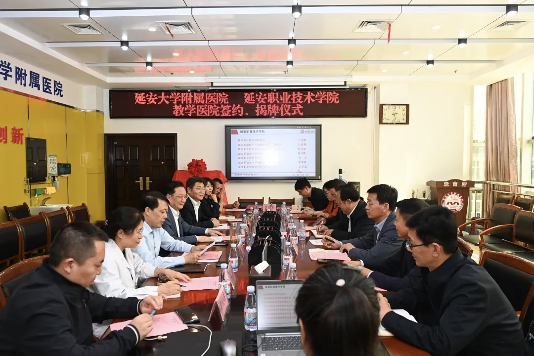 签约揭牌仪式结束后,与会人员就教学实践安排、师资队伍建设、人才培养模式等方面展开了深入交流与探讨。大家一致认为,双方应充分发挥各自优势,建立长期稳定、紧密高效的合作机制。医院将选派经验丰富的医护人员担任兼职教师,参与学院的教学工作,将临床一线的最新知识和技术传授给学生。延安大学附属医院与延安职业技术学院教学医院的签约揭牌,是教育与医疗领域协同发展的积极探索,对于推动地区医学教育进步、提升医疗卫生服务水平具有重要意义,为地区医疗卫生事业发展和医学人才培养作出更大贡献 。