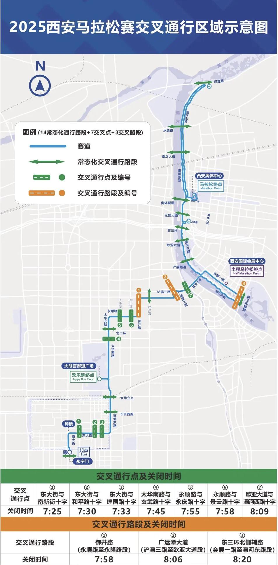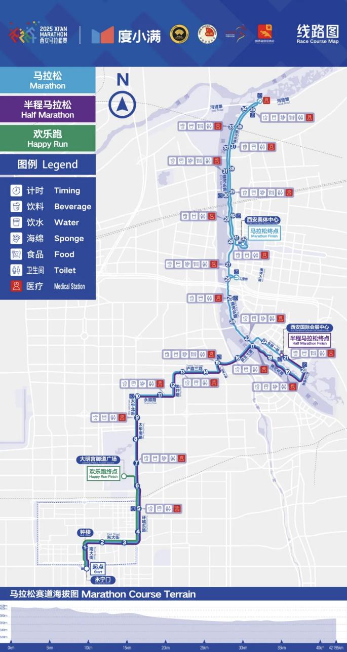 全程赛道选手将从永宁门出发,途经钟楼、东大街、长乐门等历史印迹,随后经太华路向北,最终抵达灞河之滨的西安奥体中心。半程马拉松终点设在西安国际会展中心,欢乐跑则在大明宫御道广场画上句号。