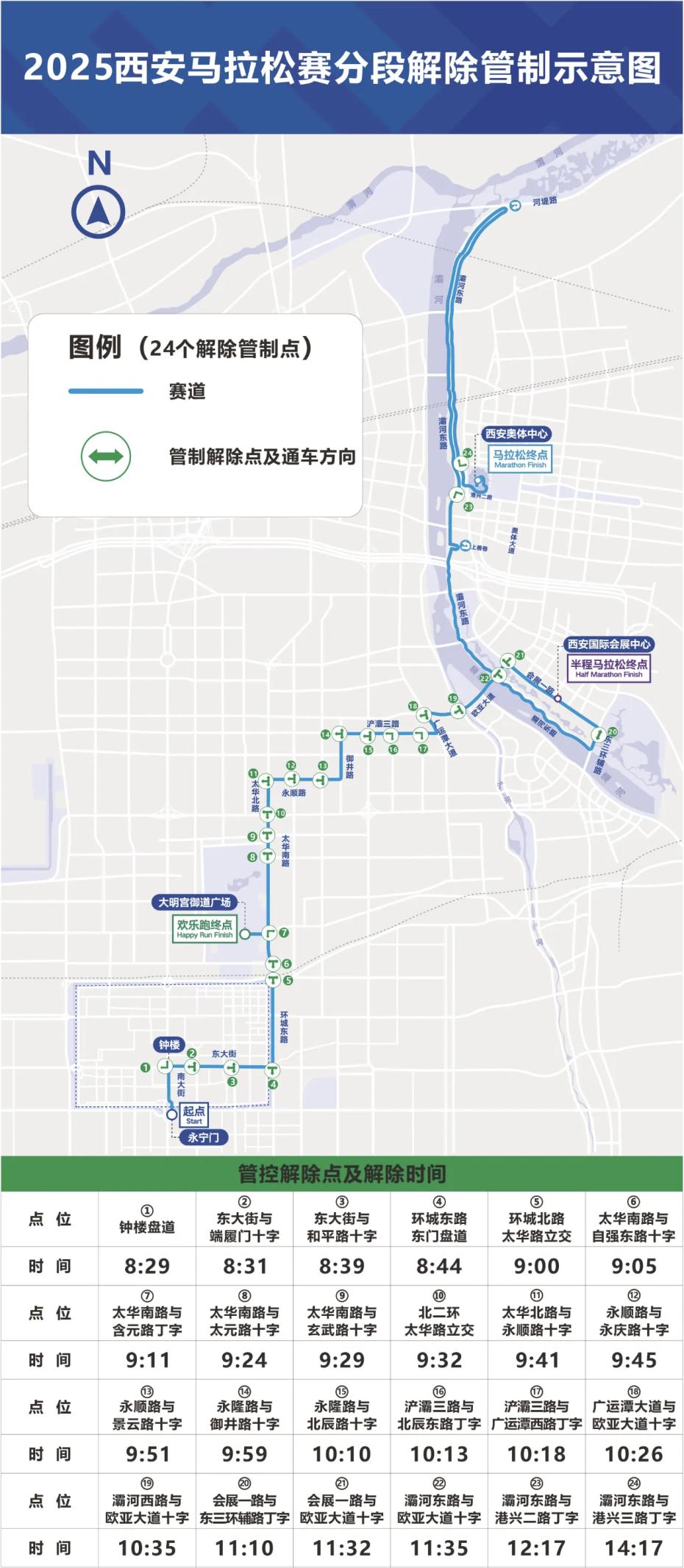 赛事结束后,交通恢复工作将同步展开。交警部门设置了24个交通管制解除点位,将根据选手通过情况滚动式恢复交通。预计从上午8时29分从钟楼盘道开始,直至下午14时17分灞河东路与港兴三路丁字,沿线道路将逐步恢复正常通行。