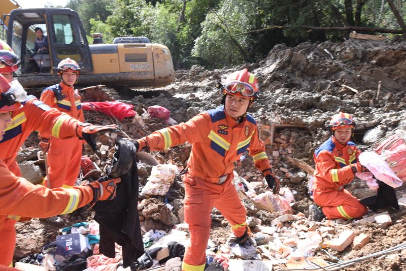 在救援现场,滑坡一片狼藉,泥土与断壁残垣相互混杂。多台挖掘机不停运转,紧张开展淤泥清理工作,并开辟临时通道。救援人员第一时间疏通滑坡体后方积水,有效防范次生灾害发生。在安全区域,消防救援人员、公安干警以及汉源街道、金家坪村干部细致开展搜索工作,尽最大努力为群众挽回财产损失。
