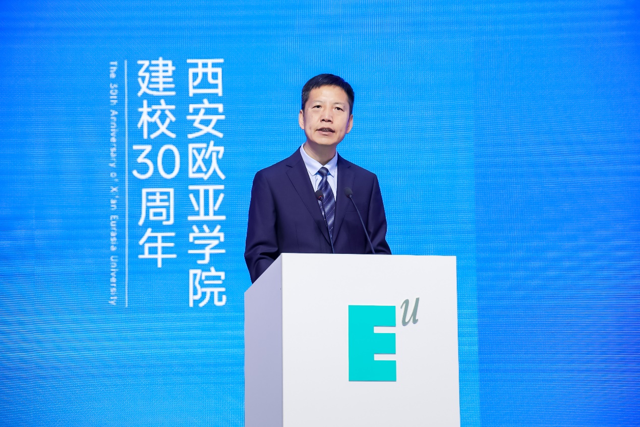 随后,中共陕西省委教育工作委员会委员、陕西省教育厅副厅长申雪峰致辞:“西安欧亚学院建校30年来,实现了从单一学科到多学科、从传统教学到‘应用型+国际化’融合创新、从发挥区域影响到全国示范的办学品牌跨越。欧亚始终秉承‘和而不同’的办学理念,坚持党的全面领导,围绕立德树人根本任务,对接区域产业发展需求,构建了独具特色的应用型人才培养体系。面向未来,希望西安欧亚学院进一步加强党建工作,坚持以习近平新时代中国特色社会主义思想为指导,牢记‘为党育人、为国育才’初心;持续深化教育教学改革,推动专业链面对产业链精准对接;不断加强师资队伍建设,打造高素质教师队伍;弘扬优良办学传统,坚持走高质量发展和特色发展道路,努力建设国内一流的应用型民办高校,为教育强省和教育强国建设作出新的更大贡献!”