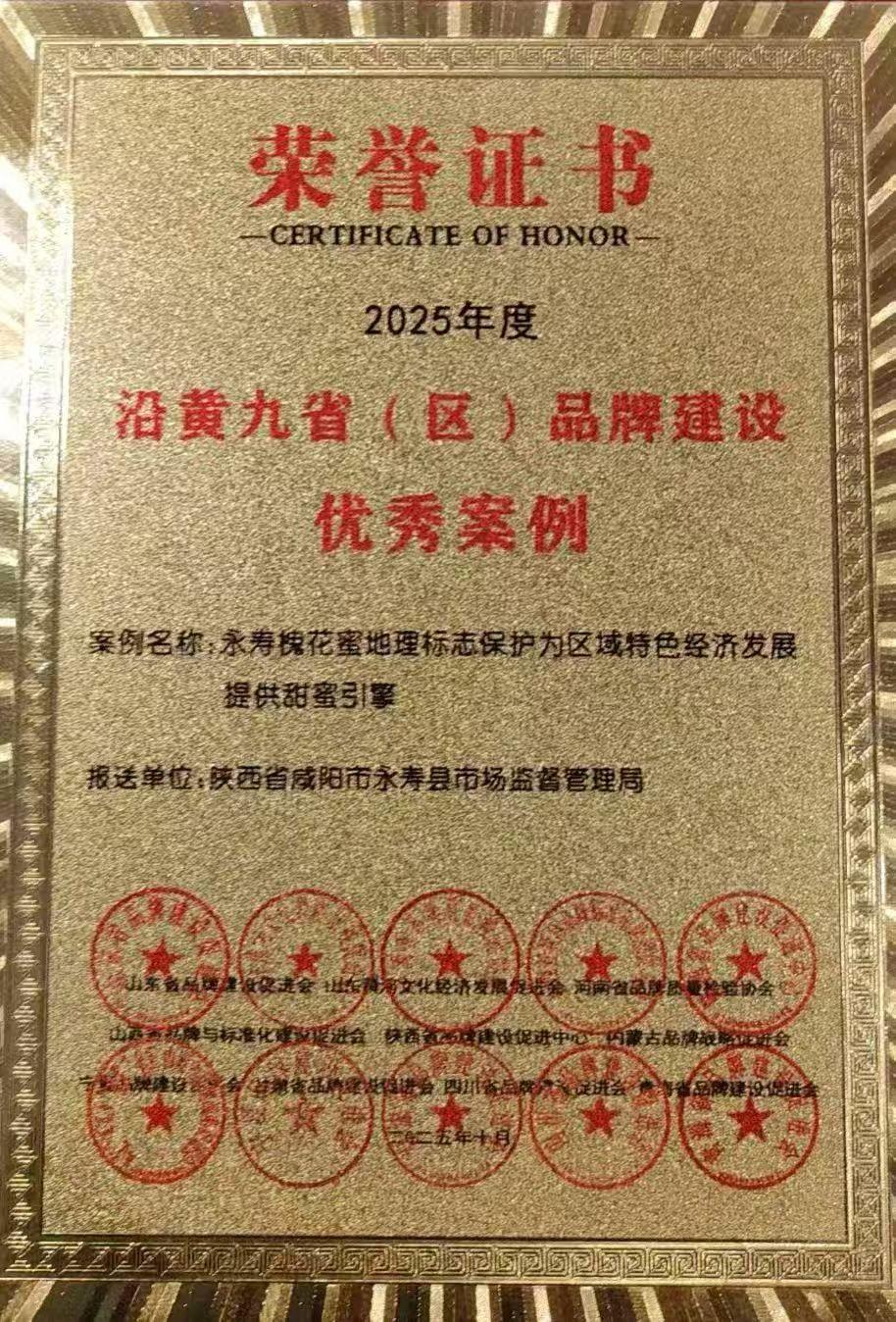 10月24日,在山东省济南市举办的沿黄九省(区)品牌建设联席会暨2025黄河品牌大会上,永寿县市场监督管理局报送的《永寿槐花蜜地理标志保护为区域特色经济发展提供甜蜜引擎》被评为沿黄九省(区)品牌建设2025年度优秀案例;“永寿槐花蜜”同步获评“黄河名品”。同时,县分管领导围绕《永寿槐花蜜区域品牌》开展现场分享与推介。
