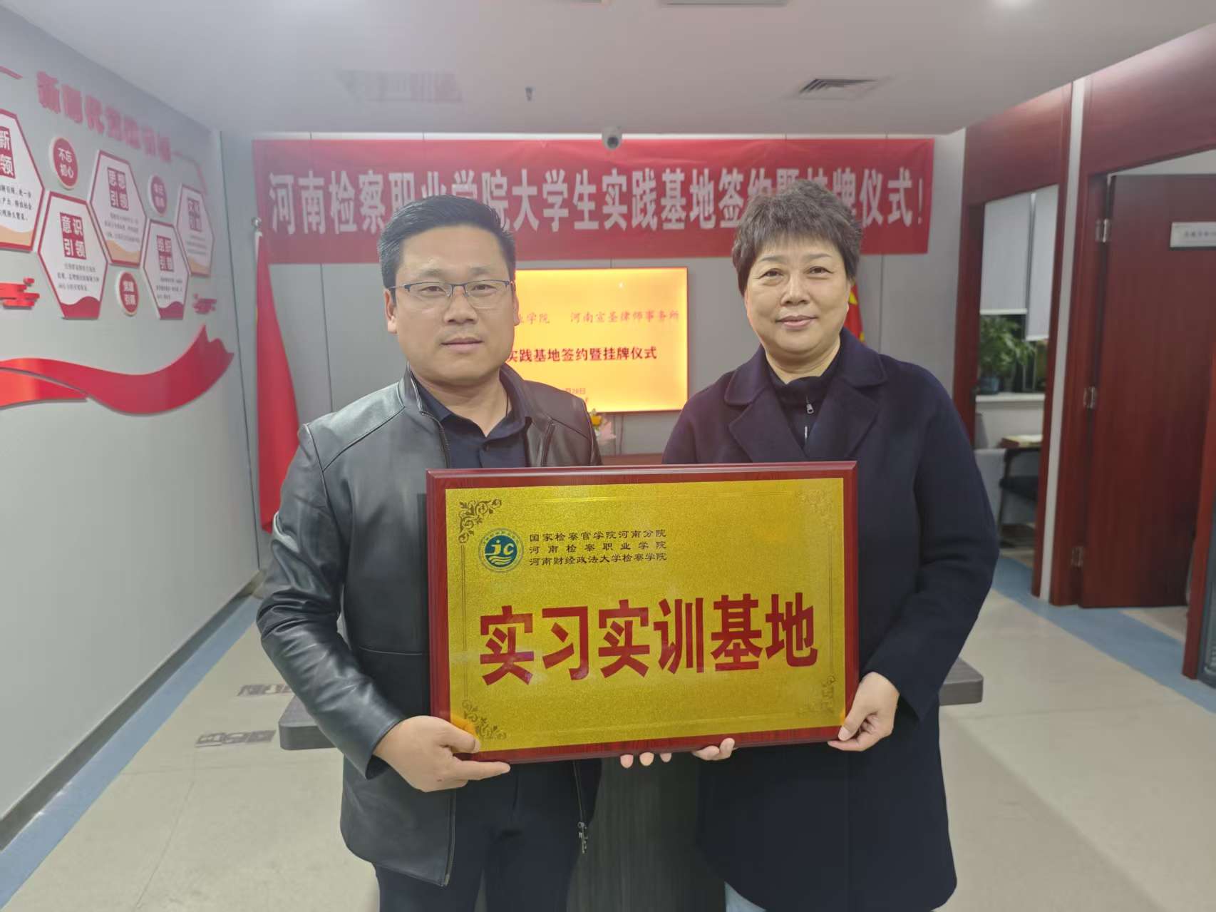 随后,双方代表共同签署《实习实训基地共建合作协议》,并为“河南检察职业学院校外实习实训基地”揭牌。根据协议,双方将在人才培养、师资互聘、课程共建、案例共享等方面开展深度合作:学院将定期选派优秀学生到律所进行实习实训,律所则将实务经验融入教学过程,通过专题讲座、联合科研等形式赋能学院教学改革。