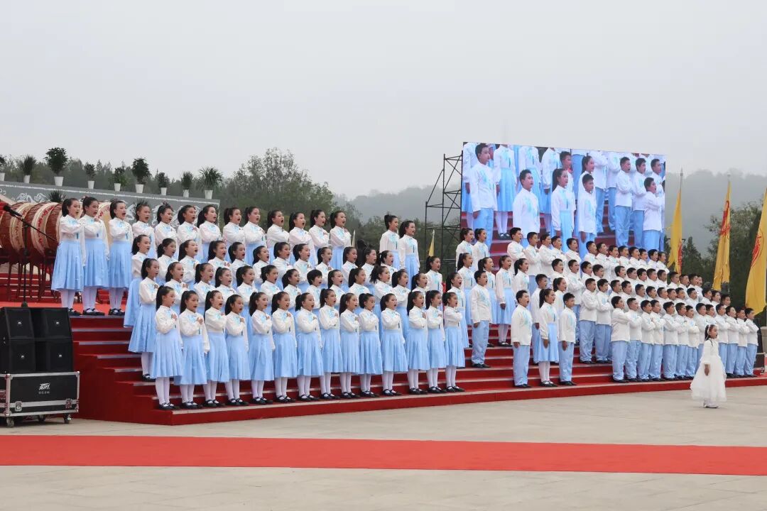 上午9时50分,民祭活动正式开始。击鼓九嗵,鸣钟九响,寓意九九重阳,九九归一,九州和谐。随后,金号三匝,大铜三发,大乐三作,细乐三吹,编钟三奏,鼓乐齐鸣。黄陵县120名学生齐诵毛泽东《祭黄帝陵文》,以稚嫩童声致敬轩辕黄帝,让优秀传统文化代代相传。