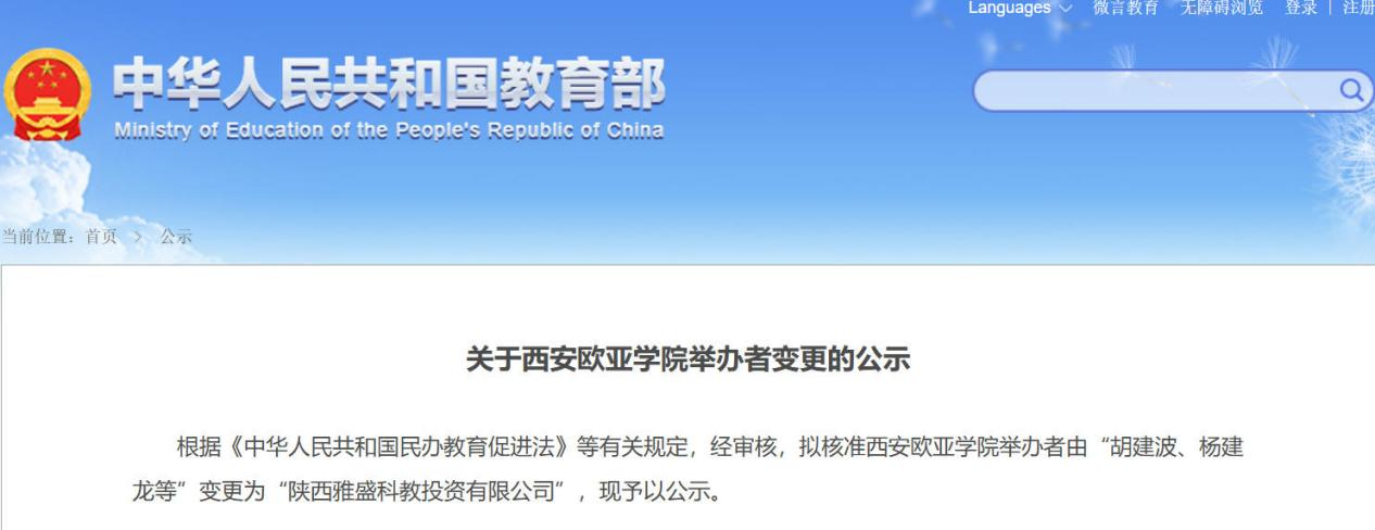 10月29日,教育部公示信息显示,西安欧亚学院的举办者拟由创始人胡建波、杨建龙等变更为“陕西雅盛科教投资有限公司”。值得关注的是,该公司法定代表人、董事长为张军宏,而胡建波仍持有60%股权,杨建龙持股14%。