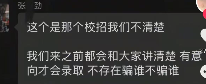 群内一员工张某劲回复称,“这个是哪个校招我们不清楚,我们来之前都会和大家讲清楚,有意向才会录取,不存在骗谁不骗谁。”“我们也没有任何收费,干一天能做就做,做不了跑路我们也不拦着,不用诋毁!”