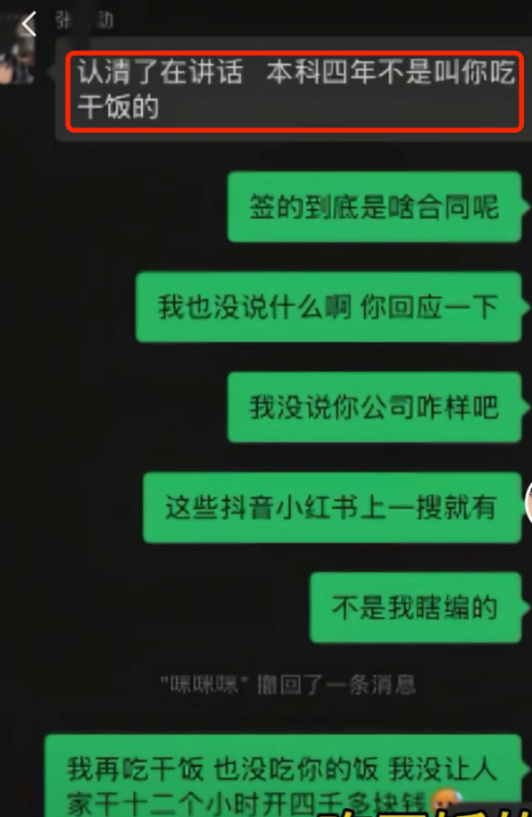 紧接着,张某劲发布了“看清了再讲话,本科四年不是叫你吃干饭的”“在我们村,你还上本科,汪汪吃的都比你好”“你连中介挣得多都没”等言论。