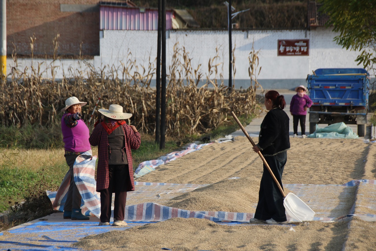 秋高气爽的日子里,远处山脉层层叠叠,白色的露营帐篷坐落在稻田间,颇有世外桃源的静谧之美。暖阳下,高平大娘在空地上翻晒稻谷:“稻子是昨天刚收的,今天晒透了装袋,留一点自己吃,剩下的等到阳历元旦就卖掉。”稻田里,还有人弯腰捡拾机器收割后漏掉的稻穗,只为颗粒归仓。