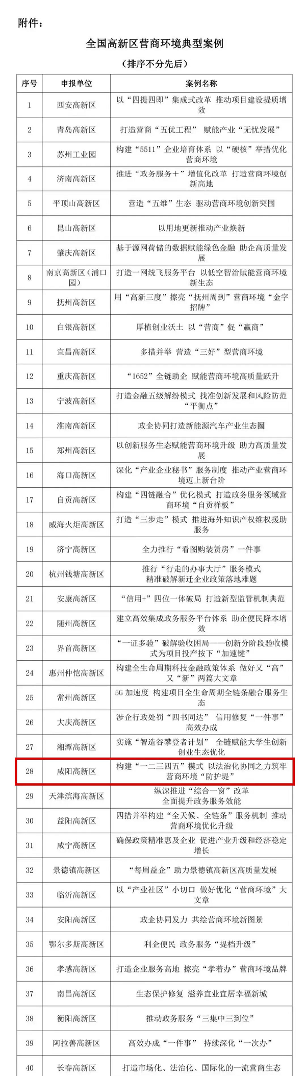 近日,全国高新区营商环境典型案例公布,全国共计50项,咸阳高新区案例获国家级认可,与西安高新区、苏州工业园区等共同入围。
