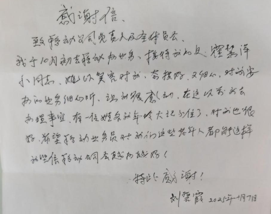 “希望移动的工作人员对我们这些老年人都能这样,也坚信移动公司会越来越好!”刘女士在信中写道。这是对西安移动适老服务的认可,也寄托着广大老年客户的美好期待。