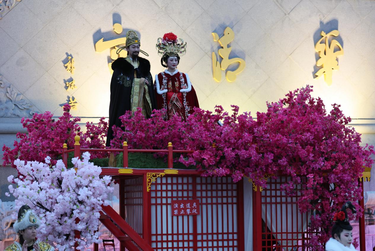 当天下午5时30分,唐宫花车巡游在景区欢快上演,媒体记者们与NPC沉浸式互动,实现从“看景”到“入戏”的转变。