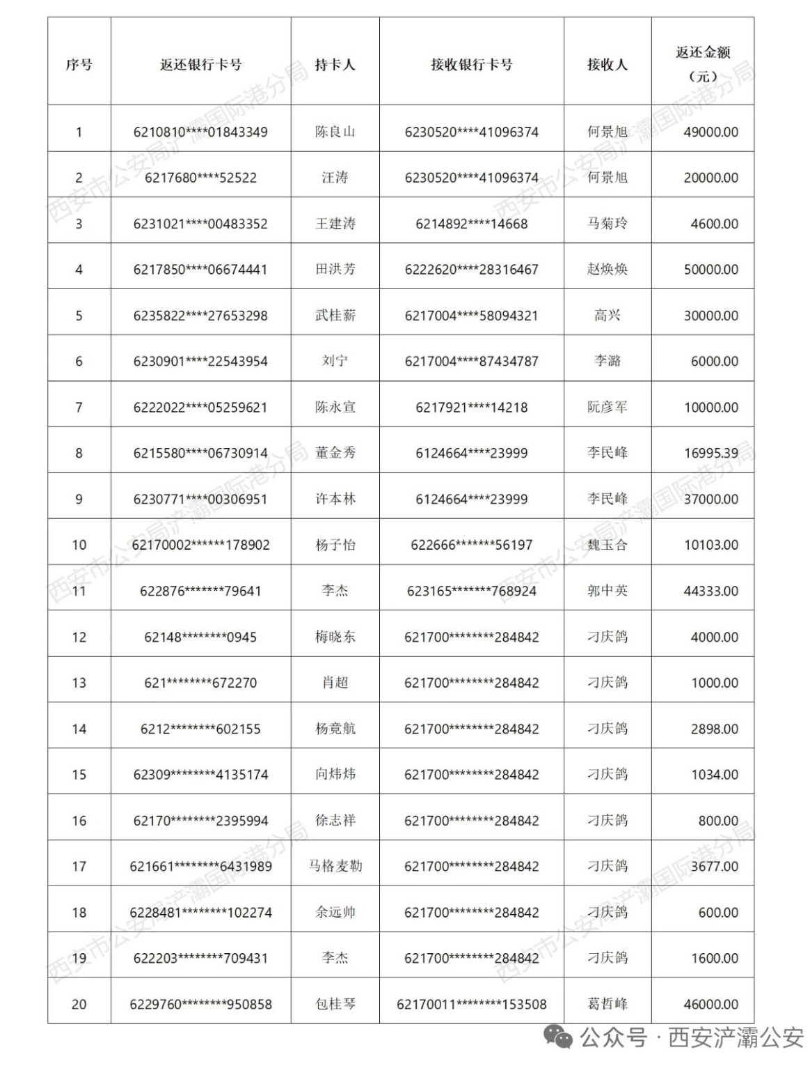 日前,西安市公安局浐灞国际港分局发布公告,正式启动一批电信网络诈骗案件的冻结资金返还工作。经依法审核,20个涉案账户中总计39.6万余元的被骗资金,将按程序陆续返还。