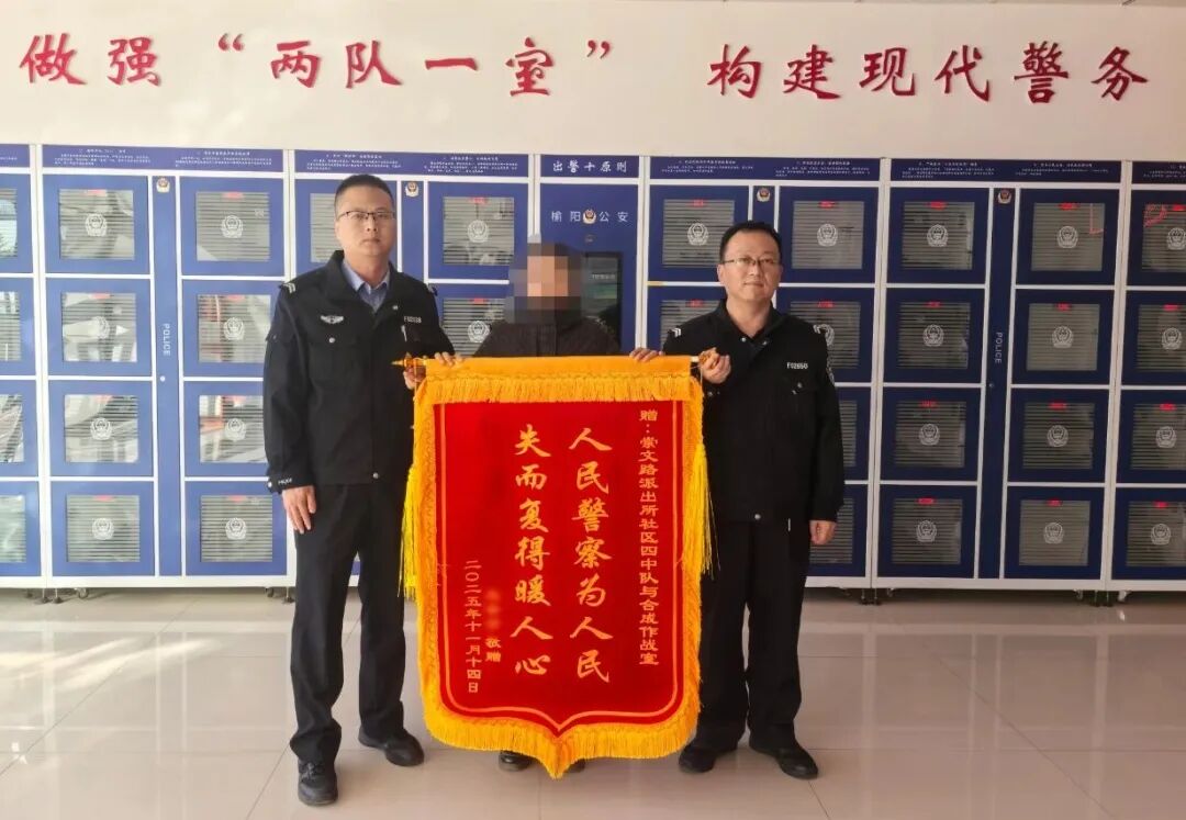 11月14日,失主王女士将一面印有“人民警察为人民,失而复得暖人心”的锦旗送到崇文路派出所民警手中。近日,崇文路派出所接到群众报警称其在下班途中骑摩托车行驶在某小区附近时,不慎将手机和社保卡丢失,手机内存储许多信息,让王女士非常焦急。接警后,派出所综合指挥室民警根据王女士提供的信息,调取沿途监控视频,最终确定了丢失物品被一名路人捡走。很快,社区民警与该路人取得联系,并将丢失物品交到王女士手中。报案不到两小时,王女士拿到失而复得的手机激动不已。