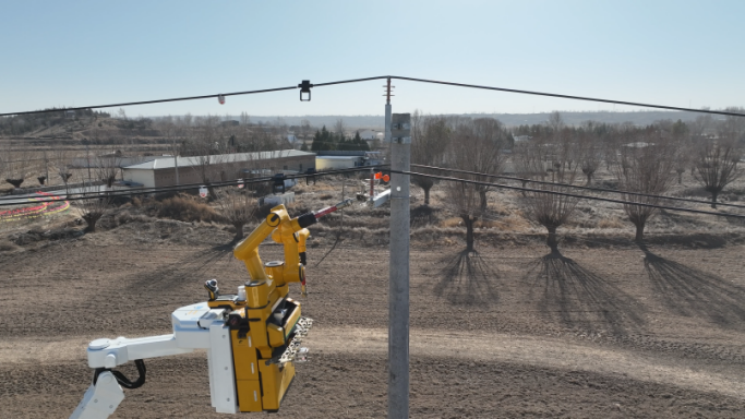 12月1日上午,在榆林市靖边县35千伏红墩界变10千伏长胜线作业点,一辆绝缘斗臂车稳稳停驻带动带电作业机器人缓缓升空,在地面操作人员的远程操控下,精准开展导线清洁、抓线,捋线、搭接等一系列复杂操作,顺利完成接火作业。这在榆林地区尚属首次。