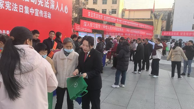 清晨的商南县政府广场,红色横幅迎风招展,法治展板整齐排列。民事审判庭、刑事审判庭、立案庭的干警们早早搭起讲台,将《中华人民共和国宪法》读本、法治宣传手册等资料整齐摆放。"宪法不是冰冷的条文,而是守护大家合法权益的'权利保障书'。"干警们用通俗易懂的方言,结合婚姻家庭、邻里纠纷等典型案例,向过往群众解读宪法的规定、原则及精神,重点宣讲习近平法治思想和党的二十届四中全会关于法治建设的部署要求。