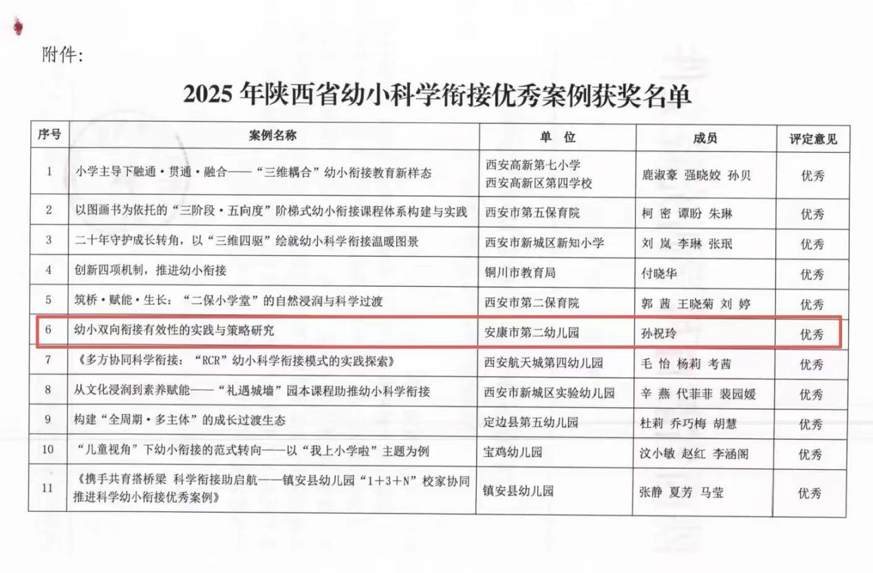 近日,在陕西省教育科学研究院主办的“幼小科学衔接优秀案例征集活动”中,安康市第二幼儿园园长孙祝玲领衔申报的案例《幼小双向衔接有效性的实践与策略研究》,凭借扎实的实践探索、创新的教育思路与显著的实践成效,在众多参评案例中脱颖而出,成功斩获“2025年陕西省幼小科学衔接优秀案例”殊荣!