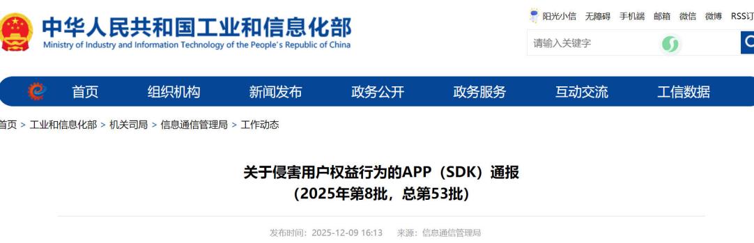 12月9日,工业和信息化部通报2025年第8批(总第53批)侵害用户权益的APP(SDK)名单,共涉及24款应用程序及软件开发工具包。这些应用存在违规收集个人信息、强制索取权限、未明示隐私政策等问题,严重侵犯用户权益。
