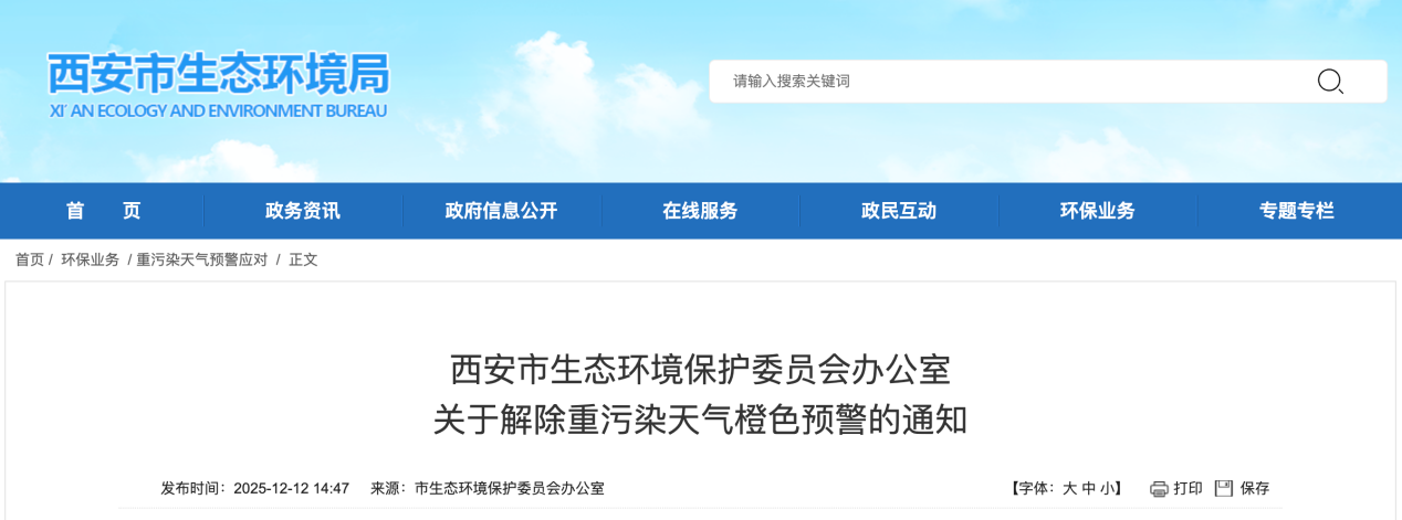 按照《西安市重污染天气应急预案(2024年修订)》(市政办发〔2024〕23号)中重污染天气预警解除的规定,市生态环境保护委员会办公室于2025年12月12日15时起解除重污染天气橙色预警,同步终止重污染天气Ⅱ级应急响应。(记者 苏珊)