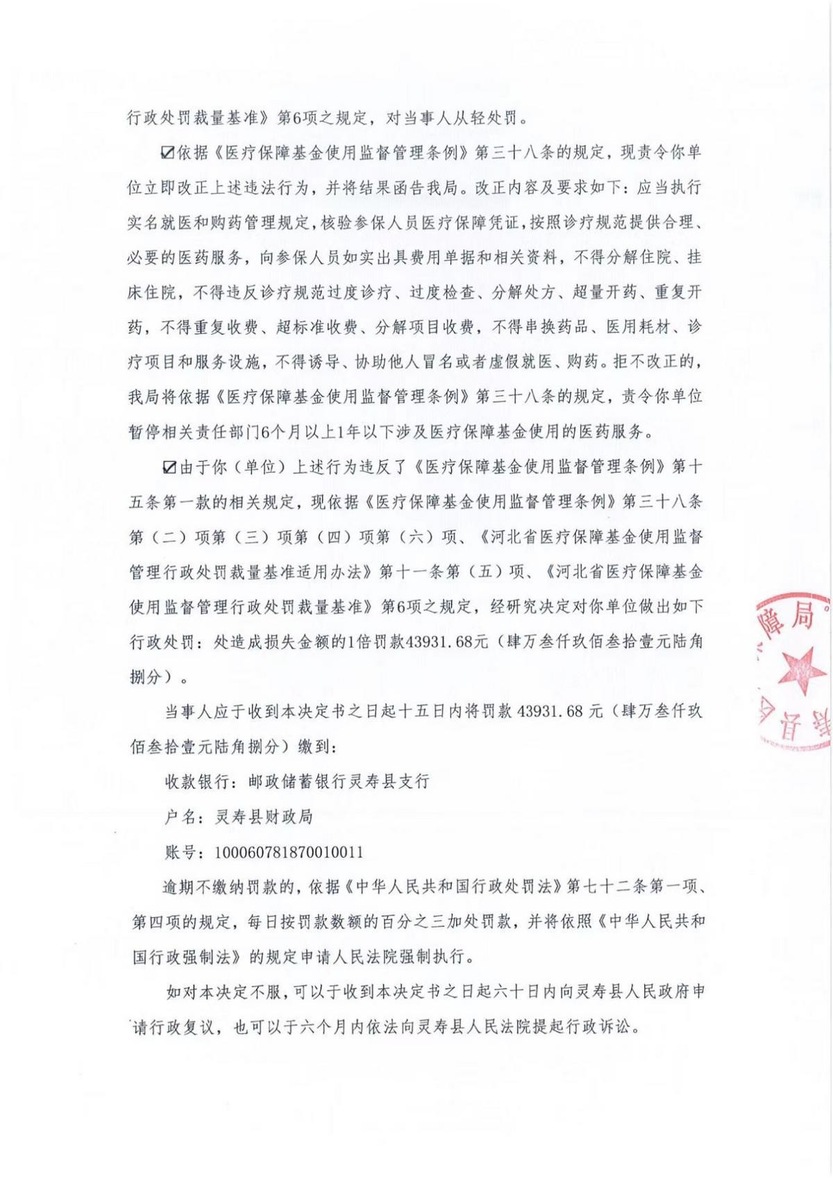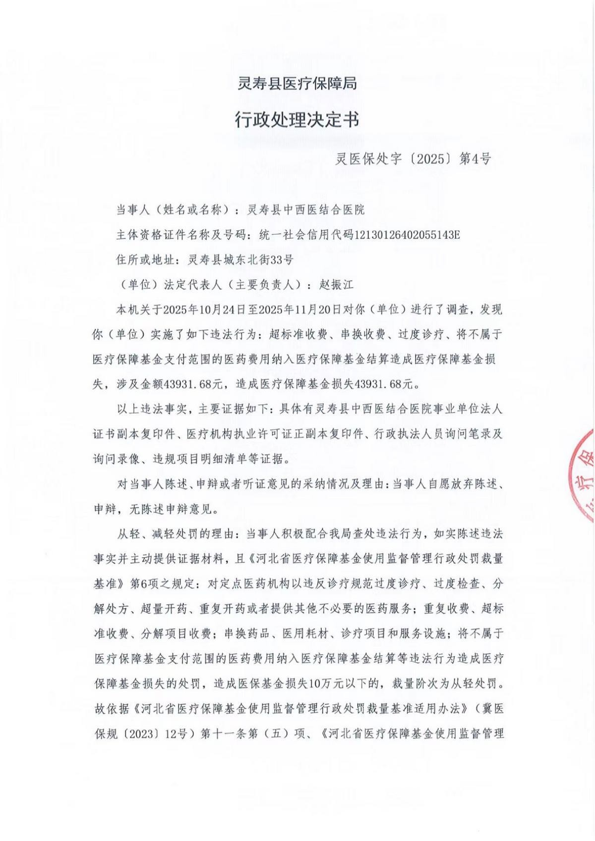 此前,2025年11月25日,灵寿县医疗保障局发布的“灵医保处字〔2025〕第4号”行政处理决定书显示,灵寿县中西医结合医院实施了如下违法行为:超标准收费、串换收费、过度诊疗、将不属于医疗保障基金支付范围的医药费用纳入医疗保障基金结算造成医疗保障基金损失,涉及金额43931.68元,造成医疗保障基金损失43931.68元。灵寿县中西医结合医院被灵寿县医疗保障局处造成损失金额的1倍罚款43931.68元(肆万叁仟玖佰叁拾壹元陆角捌分)。
