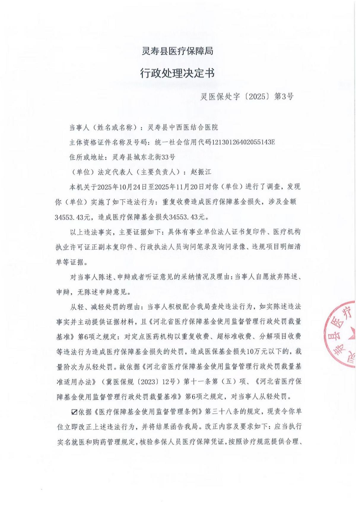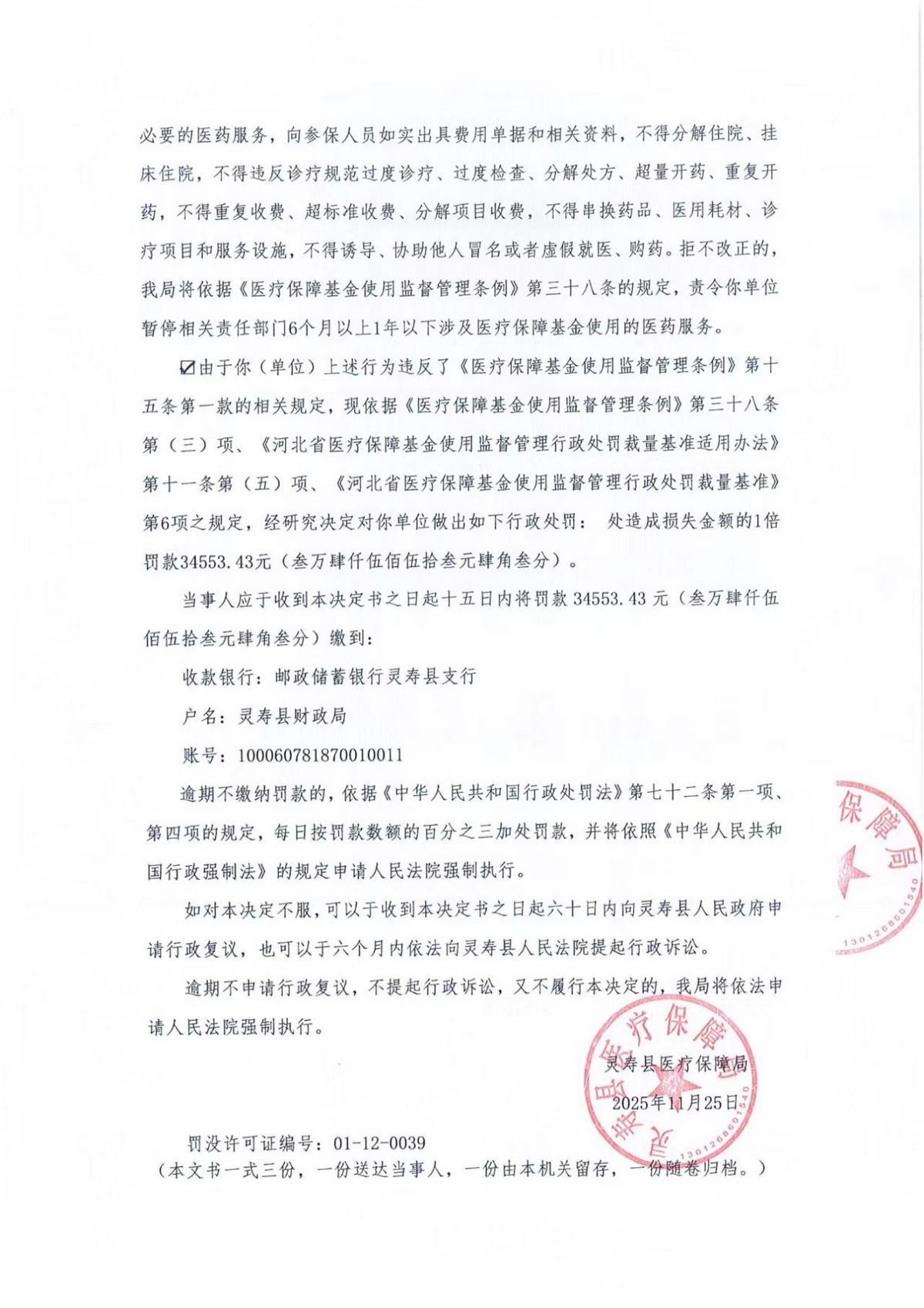 值得关注的是,11月25日同一天,因“重复收费造成医疗保障基金损失,涉及金额34553. 43元,造成医疗保障基金损失34553.43元”的违法事实(文号“灵医保处字〔2025〕第3号”),灵寿县中西医结合医院被灵寿县医疗保障局处造成损失金额的1倍罚款34553.43元(叁万肆仟伍佰伍拾叁元肆角叁分)。