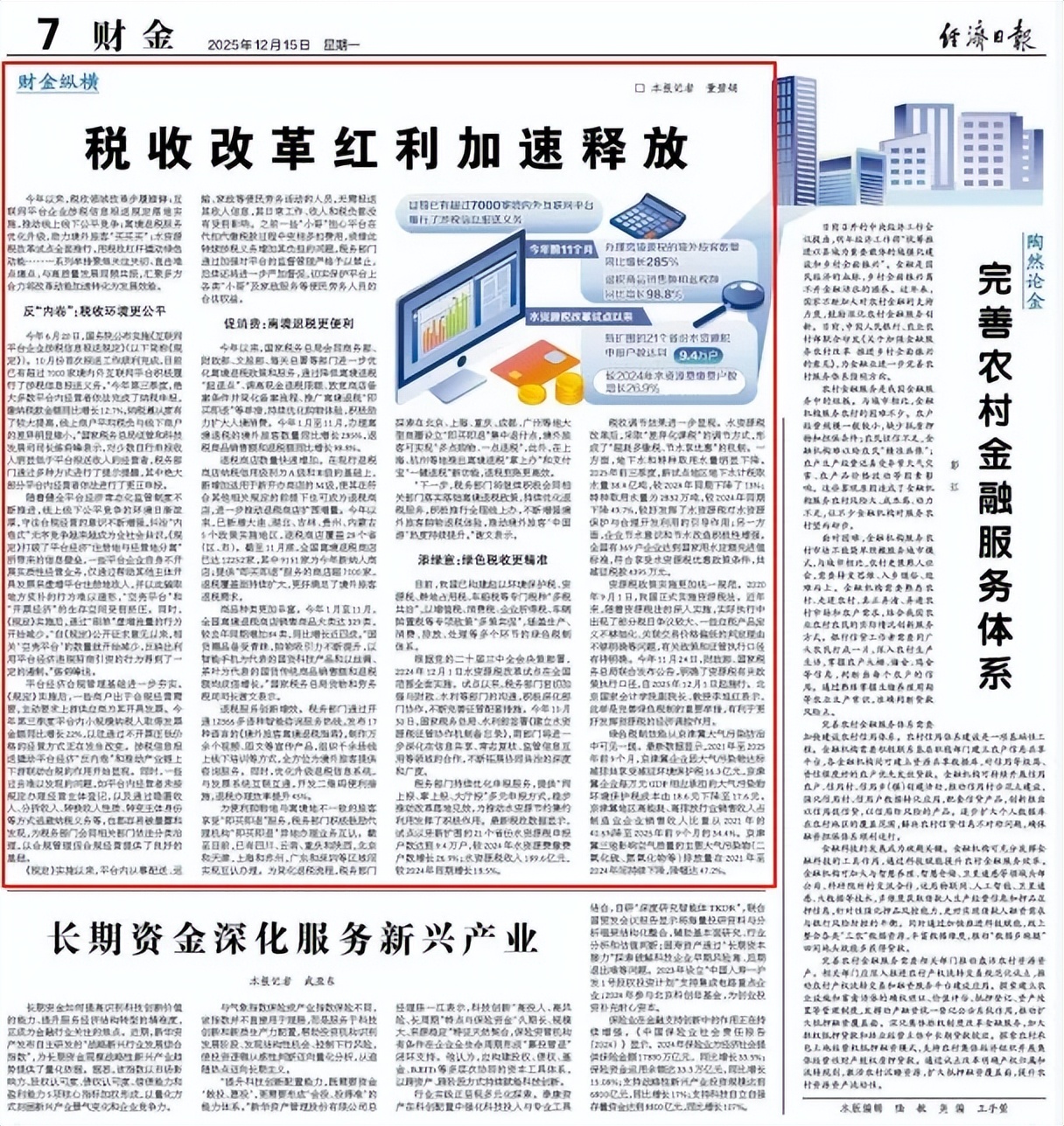 今年以来,税收领域改革步履铿锵:互联网平台企业涉税信息报送规定落地实施,推动线上线下公平竞争;离境退税服务优化升级,助力境外旅客“买买买”;水资源税改革试点全面推行,用税收杠杆撬动绿色动能……一系列举措聚焦关注关切、直击难点痛点,与高质量发展同频共振,汇聚多方合力将改革动能加速转化为发展效能。