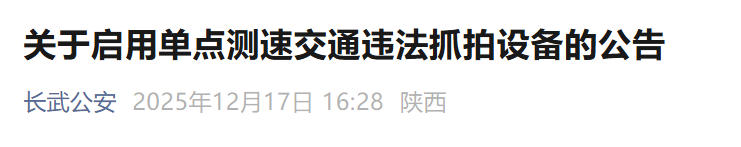 12月17日,咸阳市长武县公安局交通警察大队发布公告,为提升道路安全水平,将于12月23日0时起,正式启用8处单点测速交通违法抓拍设备。